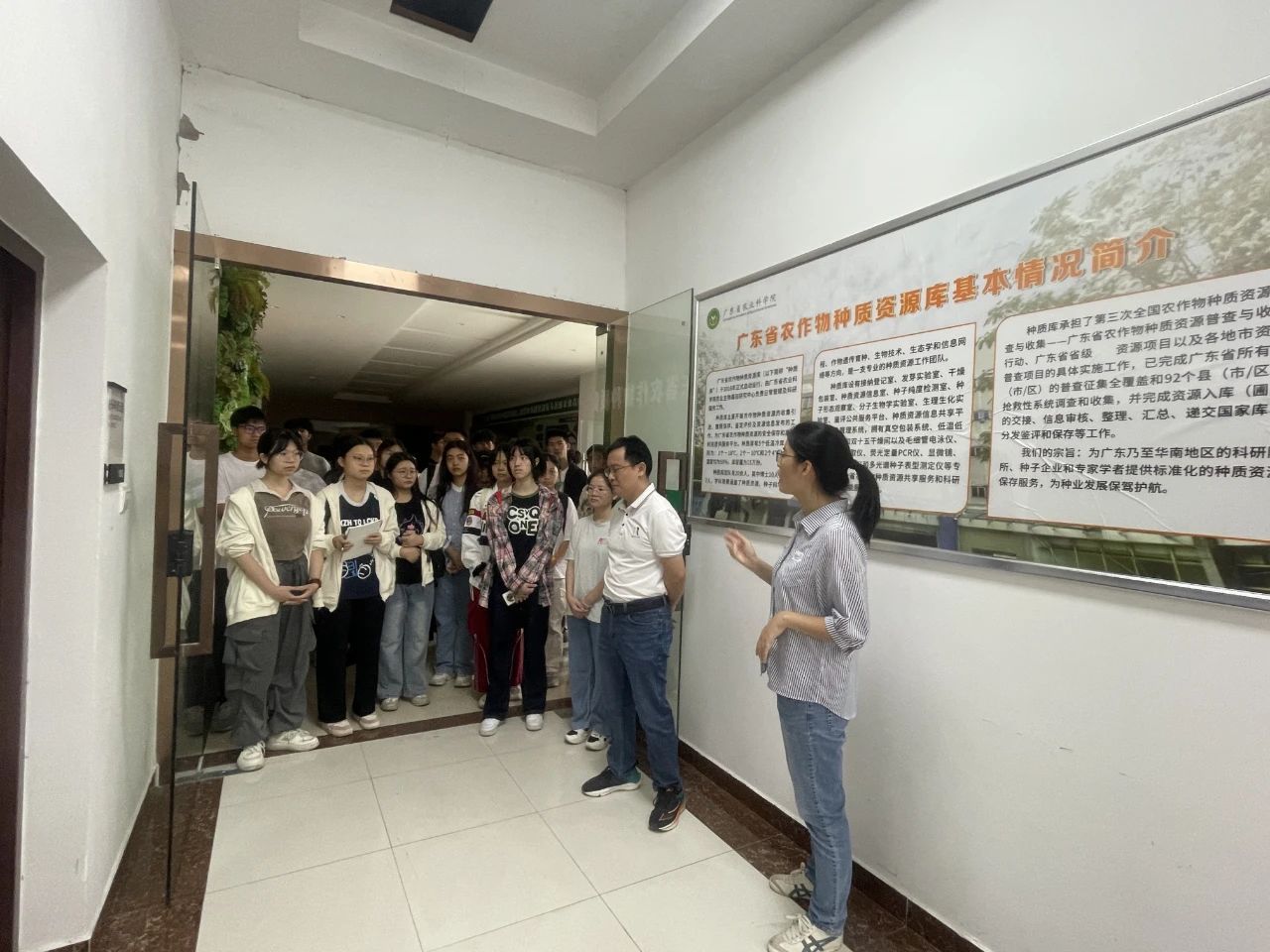 在此次活动中,广东省农科院基因中心的陈兵先研究员、贾俊婷博士和李清博士热情接待了师生一行。学生们首先参观了种子资源圃,了解了各种作物的种子资源及其特点。随后,师生们参观了广东省农作物种质资源库和种子质量检验实验室,亲眼见证了种质资源的保存过程和种子质量检验的严谨流程,这对于他们理解理论知识在实际工作中的应用具有重要意义。