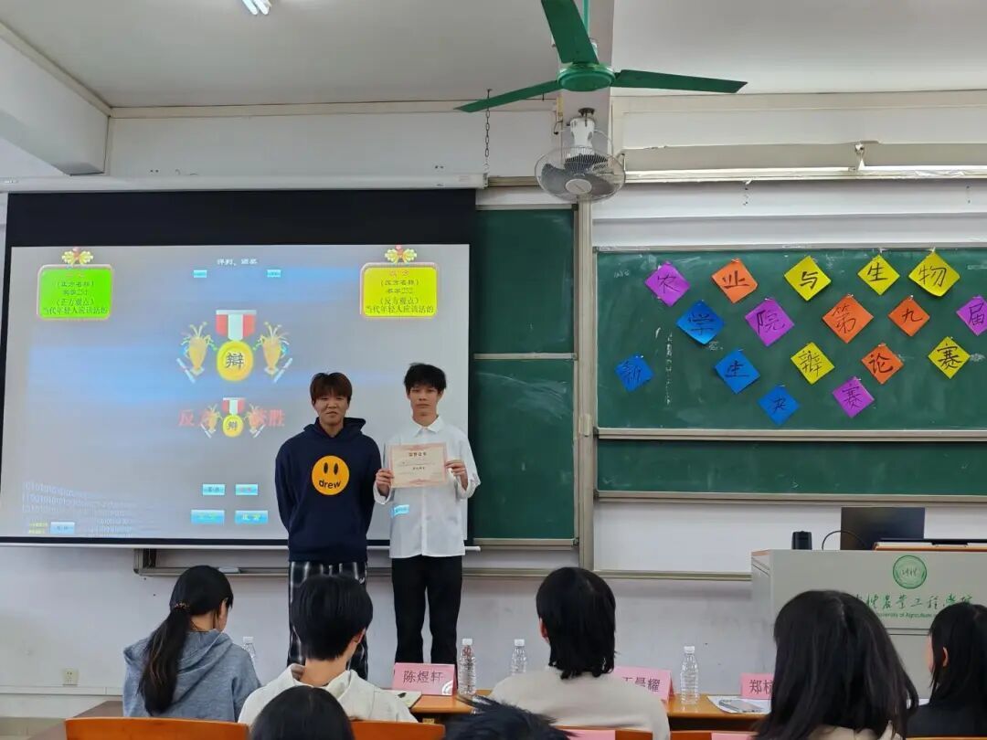 经过评委团严谨的讨论与公正打分,最终农学252班斩获本次辩论赛总决赛冠军,农学251班荣获亚军;农学251班王子豫凭借出色的个人表现,摘得“最佳辩手”荣誉称号。