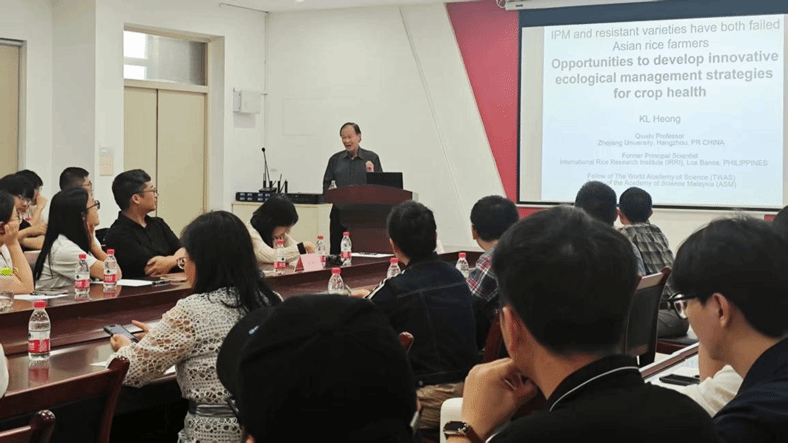 Heong Kong Luen教授首先结合亚洲稻作生产实际,围绕当前病虫害治理面临的现实问题展开了深入分析。他指出,传统的综合虫害治理(IPM)和抗性品种虽取得了不少研究成果,但在面向小农户的实际推广中仍存在明显局限。尤其是在稻作生产中,害虫监测成本高、操作复杂,抗性品种的研究成果与田间应用之间也还存在不小距离。基于此,他提出应当从单纯“防治害虫”的思路,进一步转向“作物健康”的整体管理理念,在保障产量的同时兼顾生态环境与农业可持续发展。围绕这一理念,Heong Kong Luen教授重点介绍了生态工程在水稻生产中的应用路径。例如,通过在田埂种植多样化植物、优化农田生境结构,可更好地维持农田生态系统稳定,减少对化学农药的依赖,而将稻田与鱼、鸭、蛙、螃蟹、小龙虾等生态种养模式结合起来,也能够在降低农药投入的同时提高农民收益。此外,他还谈到机器人、无人机和人工智能等新技术在现代水稻生产中的应用前景,使大家对未来农业绿色发展与智能化管理的结合有了更直观的认识。