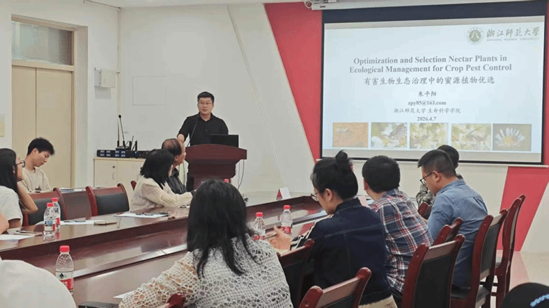 朱平阳教授围绕“有害生物生态治理中的蜜源植物优选”这一主题展开报告。他系统介绍了蜜源植物在农业生态系统中的重要作用,并从筛选原则、配置方式和应用场景等方面阐述了其在病虫害生态调控中的实际意义。他强调,科学筛选和合理配置蜜源植物,能够为天敌昆虫提供稳定的食物来源和栖息环境,从而增强农田生态系统对病虫害的自然控制能力。结合稻田案例,朱平阳进一步分析了蜜源植物在促进生物多样性、减少农药依赖和提升绿色防控效果等方面的积极作用,并对蜜源植物与农田生态景观协同建设的应用前景作了展望。报告兼具理论性与实践性,使在场师生对生态治理中的植物配置策略及其应用价值有了更深入的认识。