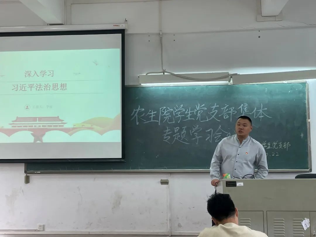 为深入学习习近平法治思想,推进全面依法治国,也为进一步提高学生党员的法治意识,2021年10月22日中午,yl6776永利集团各学生党支部在杨钊杨勋楼402召开习近平法治思想专题学习会议,学生党支部书记孙晓芳、苏登、李城出席了会议,全体学生党员参加了本次会议。此次学习会由植物保护学生党支部代理书记李城主讲。
