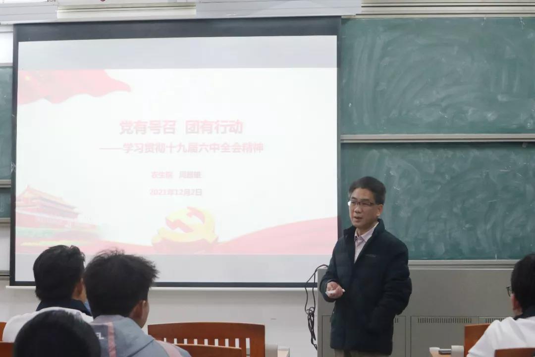 接着,周超雄中国共产党十九届六中全会精神,从九个方面展开论述,一是审议通过两个决议,二是总结党的百年奋斗重大成就和历史经验的3个“需要”等方面,深刻阐释了十九届六中全会的内容。周超雄高度概括其意义为“过去为什么我们能够成功,未来我们怎样才能继续成功”,并总结其原因为善于学习、善于总结、自我肯定这三个方面,同时具体展开说明了审议通过的两个文件《中共中央关于党的百年重大成就和历史经验的决议》、《关于召开党的第二十次全国代表大会的决议》。回顾党的百年奋斗重大成就和历史经验,周超雄向同学们提出当代大学生要有家国情怀,生于忧患、死于安乐的思想感悟,同时也要有开拓创新、胸怀天下的精神。