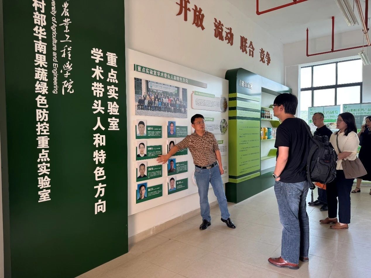 喻国辉副院长(主持工作)首先带领慕恩科技有限公司一行参观了农业农村部华南果蔬绿色防控重点实验室,并向客人介绍了实验室的人才队伍、学科方向和在土传维管束病害生物防治研究方面取得的成效,展示了学院在农业科技领域的创新能力和实践水平,双方对未来在微生物研究和应用等方面的合作充满期待。