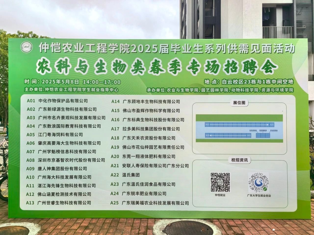 5月8日下午,6776永利集团农科与生物类2025届毕业生春季专场招聘会在学生社区23栋与1栋中间空地举办。本次招聘会由我校学生就业指导中心主办,yl6776永利集团、园艺园林学院、动物科技学院、资源与环境学院共同承办,汇集了来自农业、生物、食品等多个行业的用人单位,共有26家单位来到招聘现场,提供了约400余个就业岗位。校党委常委、副书记朱立学,学生工作部部长沈洁,副部长严丽纯,yl6776永利集团党委书记周超雄,园艺园林学院党委副书记王红山以及各学院辅导员到现场了解用人单位人才需求以及毕业生应聘情况。